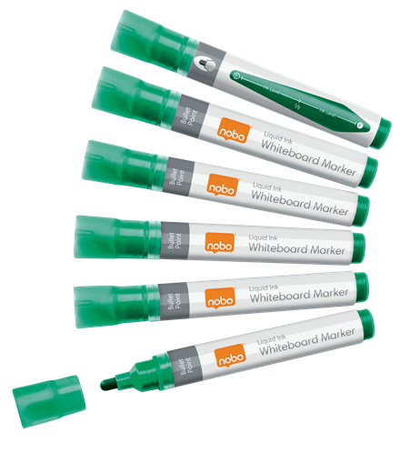 Setul de markere NOBO cu cerneală lichidă este perfect pentru folosirea zilnică, este versatil și se folosește pe suprafețe neporoase, ca și tablele din sticlă sau oțel emailat. Markere cu uscare rapidă ce se îndepărtează ușor cu ajutorul unei lavete uscate. Aceste markere au o ferestră care arată conținutul rezervorului de cerneală, astfel știi exact când trebuie să achiziționezi unul nou. Sunt disponibile în mai multe culori și sunt ideale pentru școală, birouri și pentru acasă. Pachetul coține 10 markere cu vârful tip glonț, de 3 mm. Folosește-le împreună cu tablele NOBO pentru performanță optimă. Markerele nu sunt permanente.