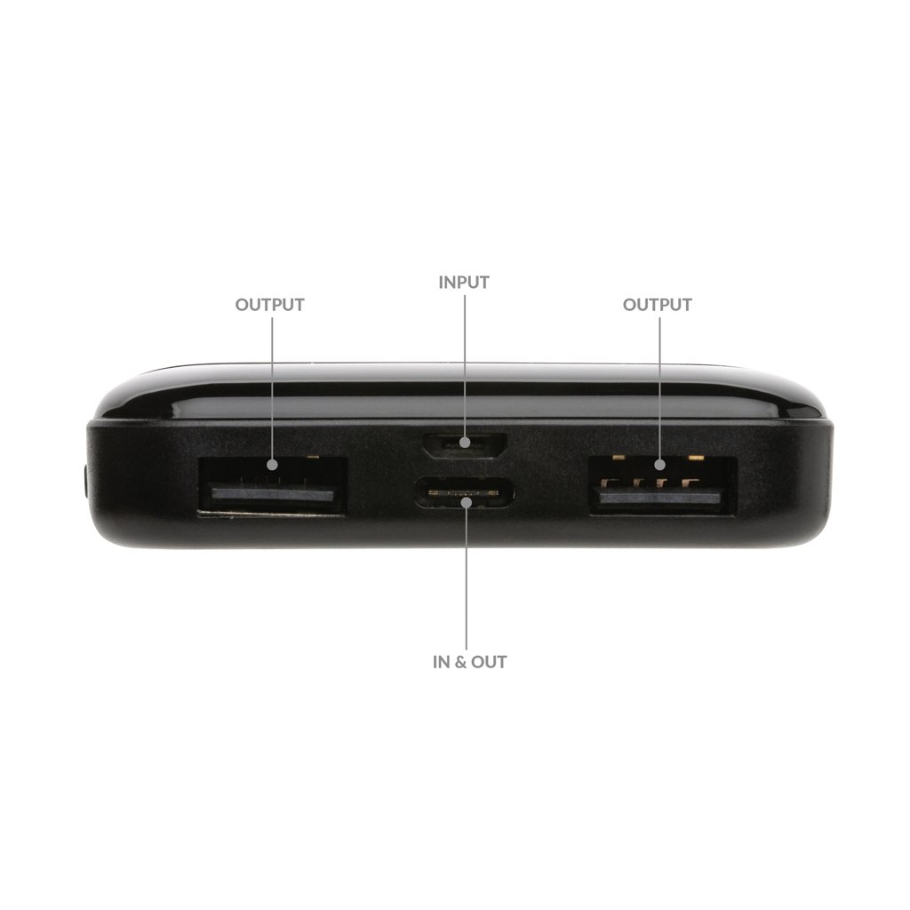 Usor, compact si prietenos cu mediul, powerbank-ul RCS 5.000 mAh este companionul perfect pentru incarcare rapida oriunde te afli. Realizat din plastic reciclat certificat RCS (30% continut reciclat total), acest model garanteaza o trasabilitate completa a materialelor reciclate pe tot lantul de productie. Cu porturi multiple – USB-A, Type-C si Micro USB – iti ofera flexibilitate maxima pentru incarcare rapida a pana la 3 dispozitive simultan. Bateria Li-Polymer clasa A ofera pana la 2 incarcari complete ale telefonului tau, iar indicatorii LED afiseaza in timp real nivelul de energie ramas. Include cablu TPE reciclat certificat RCS si este complet PVC free. Ambalat in cutie sustenabila FSC® mix. Input Micro USB: 5V/2A; Input Type-C: 5V/2.4A; Output USB: 5V/2.4A; Output Type-C: 5V/2A.