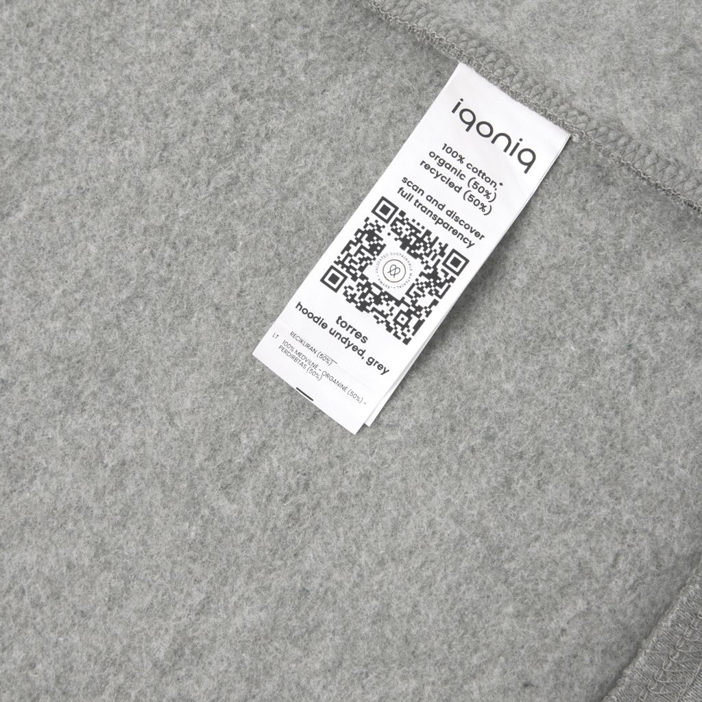 IQONIQ Torres este varianta naturala a hanoracului clasic Jasper — acelasi confort premium, dar fara proces de vopsire. Fabricat din 100% bumbac (50% reciclat si 50% organic), cu o densitate de 340 G/M², hanoracul imbina fibrele de bumbac reciclat in culoarea lor naturala cu bumbacul organic virgin, rezultand un efect melanj subtil si autentic. Interiorul moale din fleece periat asigura caldura si confort in orice anotimp, iar croiala clasica ofera o potrivire echilibrata, potrivita oricui. Prin tehnologia AWARE™, fiecare hanorac beneficiaza de trasabilitate completa si verificare blockchain, garantand autenticitatea materialelor reciclate si organice. Scanand codul QR, poti accesa pasaportul digital al produsului si informatiile despre impactul sau ecologic. Certificarea OEKO-TEX® STANDARD 100 Centexbel confirma siguranta materialelor pentru piele. In plus, 2% din incasari sunt donate catre Water.org, sustinand proiecte pentru acces la apa curata. Fiecare hanorac are o nuanta unica datorita absentei procesului de vopsire si texturii firelor reciclate.