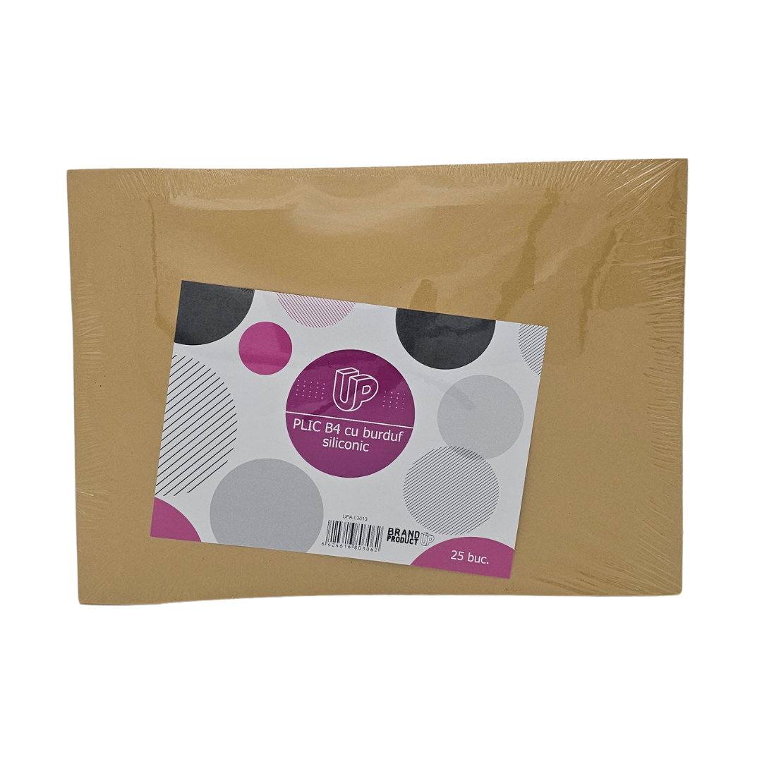 Plic B4 cu burduf siliconic maro, destinat trimiterii documentelor groase sau a materialelor care necesita spatiu suplimentar. Produs realizat in productie proprie, in Unitate Protejata.