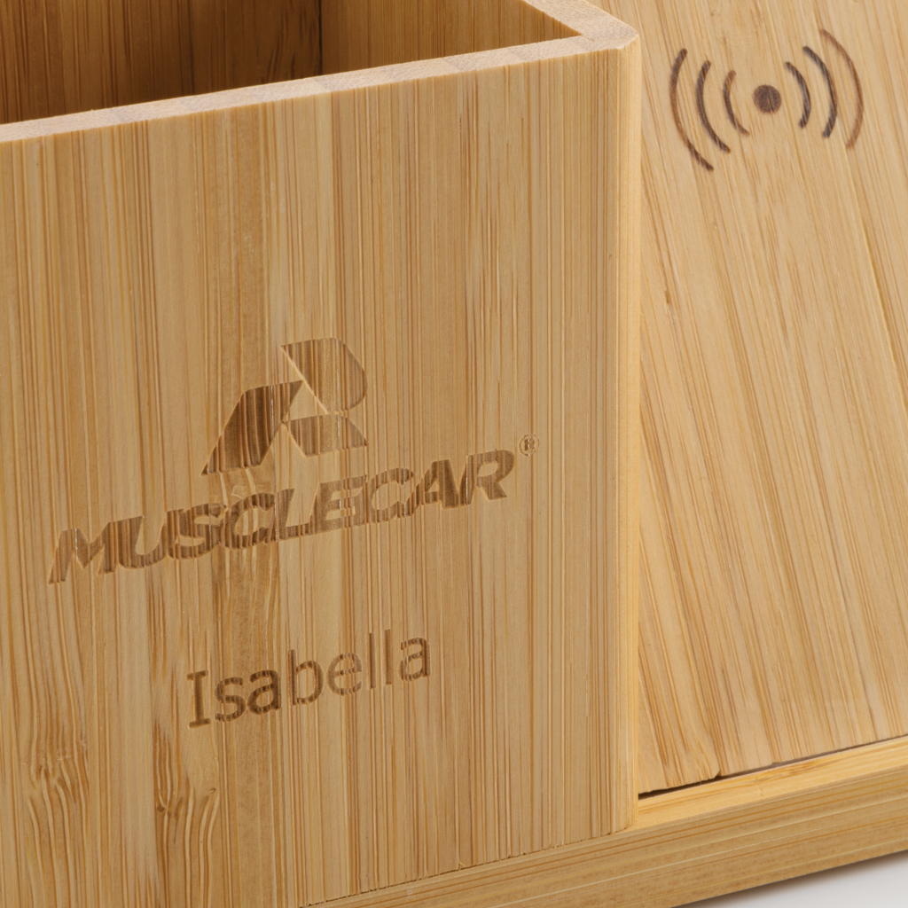 Adauga o nota naturala biroului tau cu Calgary – incarcatorul wireless 10W din bambus certificat FSC® 100%. Acest incarcator elegant si multifunctional include un suport pentru pixuri, fiind perfect pentru a-ti mentine spatiul organizat. Fabricat din ABS reciclat certificat RCS (6% continut reciclat total), Calgary combina designul minimalist cu eficienta unei incarcari rapide de 10W, compatibile cu toate dispozitivele QI – iPhone 8 si modelele mai noi, precum si telefoanele Android moderne. Include un cablu USB-C de 120 cm realizat din TPE reciclat certificat RCS. Produsul si accesoriile sunt 100% fara PVC si ambalate intr-o cutie kraft FSC® mix.
