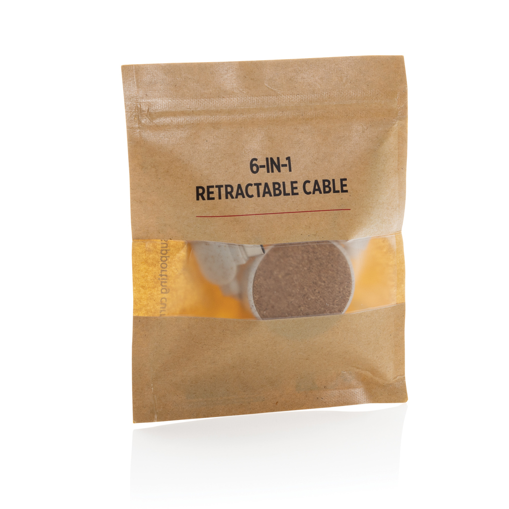 Incarca-ti dispozitivele in stil eco cu cablu retractabil 6-in-1 din pluta si paie de grau – un accesoriu modern, multifunctional si prietenos cu mediul. Conceput pentru a oferi versatilitate totala, acest cablu permite incarcarea oricarui dispozitiv de la orice sursa USB, datorita celor doua intrari (USB-A si USB-C) si trei iesiri (USB-C, Micro USB si conector dublu pentru iOS/Android). Cu o lungime maxima de 100 cm si mecanism retractabil, este ideal pentru birou, acasa sau calatorii, evitand incurcarea cablurilor. Fabricat din pluta naturala si paie de grau (35%) combinate cu ABS durabil si cablu TPE fara PVC, ofera incarcare rapida de 5V/2A - 9V/2A si suporta CarPlay si Android Auto. Compact, elegant si ecologic – acest cablu 6-in-1 este companionul perfect pentru toate dispozitivele tale moderne.