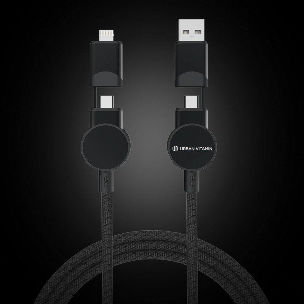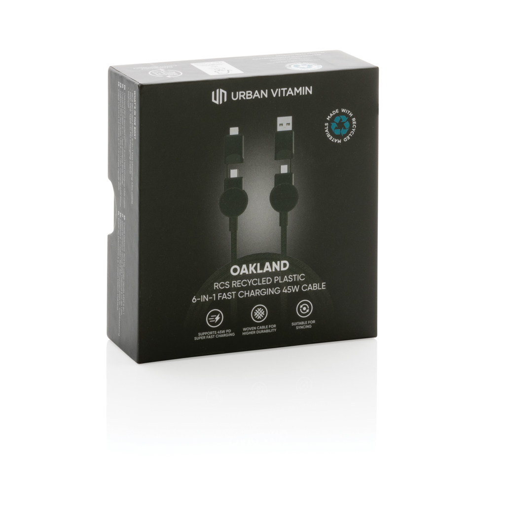 Incarca-ti toate dispozitivele in cel mai eficient mod cu cablu Oakland 6-in-1 fast charging 45W din plastic reciclat RCS. Creat pentru performanta maxima si sustenabilitate, acest cablu este fabricat din TPE reciclat 100% pentru carcasa si miez, iar stratul exterior este realizat din rPET reciclat 100%. Cu certificare RCS (Recycled Claim Standard), cablul garanteaza o trasabilitate completa a materialelor reciclate. Datorita puterei maxime de 45W (Type-C la Type-C) si 18W (Type-C la Lightning), incarcarea este extrem de rapida si stabila. Cablul de 120 cm include 5 conectori multifunctionali – USB-C in, USB-A in, Type-C out, iOS out si micro USB out – oferind compatibilitate totala cu dispozitive moderne, inclusiv telefoane, tablete si laptopuri. Suporta CarPlay si Android Auto, transfer de date si este complet PVC free. Ambalat responsabil in cutie reciclabila cu continut redus de plastic, Oakland este alegerea perfecta pentru o incarcare rapida, sigura si ecologica.