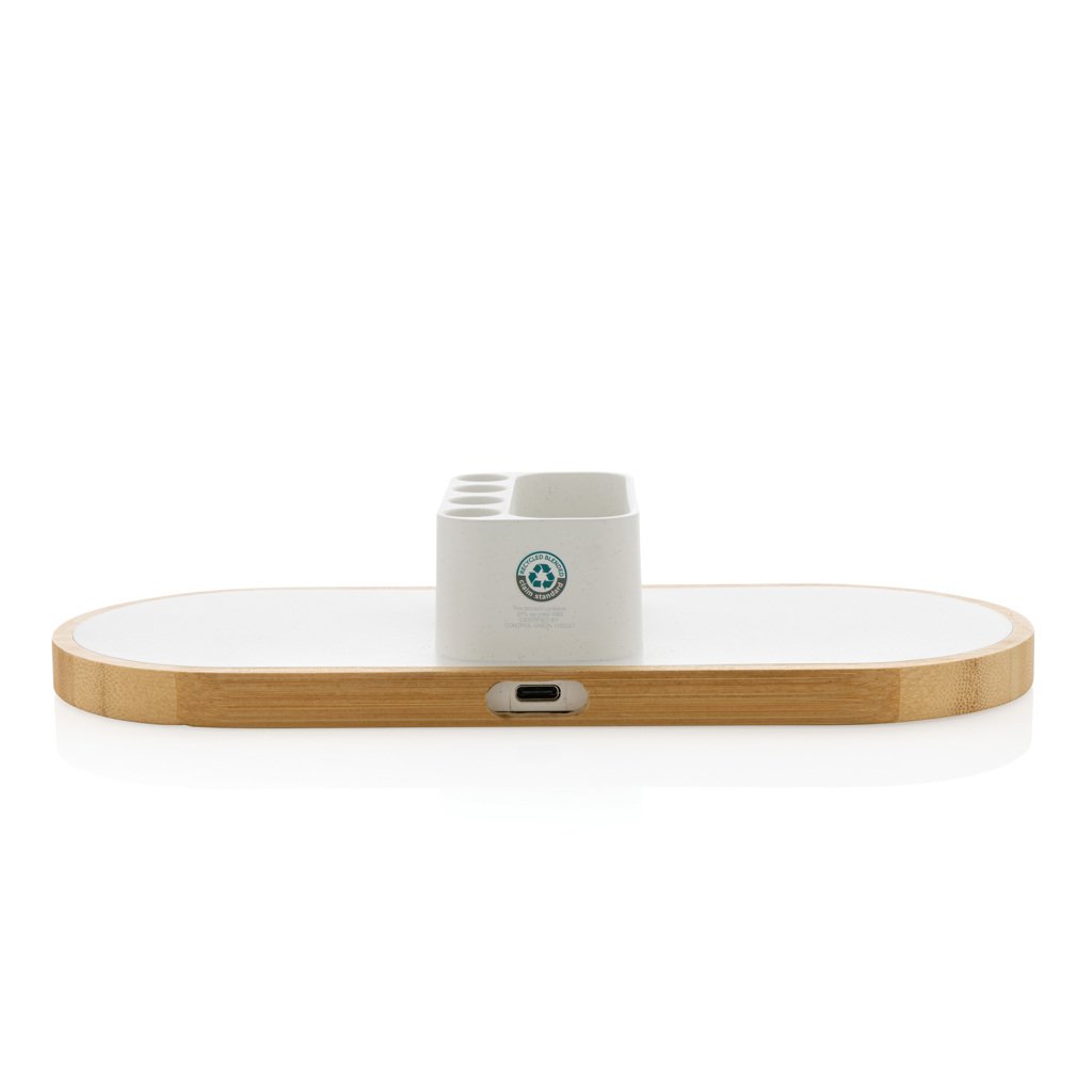 Descopera Ontario – incarcatorul wireless dual 10W cu suport multifunctional, creat pentru un birou ordonat si modern. Realizat din ABS reciclat certificat RCS si cu baza din bambus certificat FSC® 100%, acest incarcator ofera un echilibru perfect intre functionalitate si stil natural. Datorita celor doua bobine de incarcare wireless de 10W, poti incarca simultan doua telefoane sau alte dispozitive compatibile QI (iPhone 8 si modele mai noi, precum si Android). Include suport pentru pixuri cu 4 orificii si spatiu pentru carti de vizita sau obiecte mici. Incarcatorul vine insotit de un cablu USB-C de 120 cm realizat din TPE reciclat certificat RCS. Produsul si accesoriile sunt 100% fara PVC si ambalate intr-o cutie kraft FSC® mix.