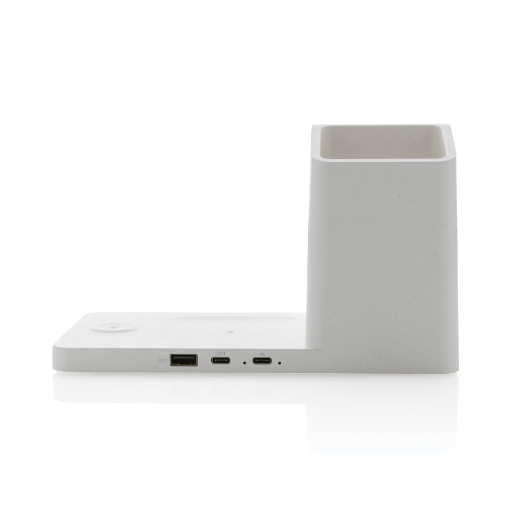 Pastreaza-ti toate dispozitivele incarcate cu Ontario – incarcatorul wireless 3-in-1 realizat din plastic reciclat certificat RCS si bambus FSC® 100%. Acest incarcator multifunctional combina eleganta naturala a bambusului cu tehnologia moderna de incarcare rapida de pana la 15W. Echipat cu trei zone de incarcare wireless – una de 15W pentru telefon, una de 5W pentru casti si una de 2.5W pentru smartwatch – Ontario iti permite sa incarci simultan toate dispozitivele esentiale. Include, de asemenea, porturi USB-A si USB-C pentru incarcare suplimentara prin cablu si suport pentru pixuri integrat. Compatibil cu toate dispozitivele QI (iPhone 8 si modelele mai noi, Android). Include cablu USB-C de 120 cm realizat din TPE reciclat certificat RCS. Produsul este 100% fara PVC si ambalat in cutie kraft FSC® mix.