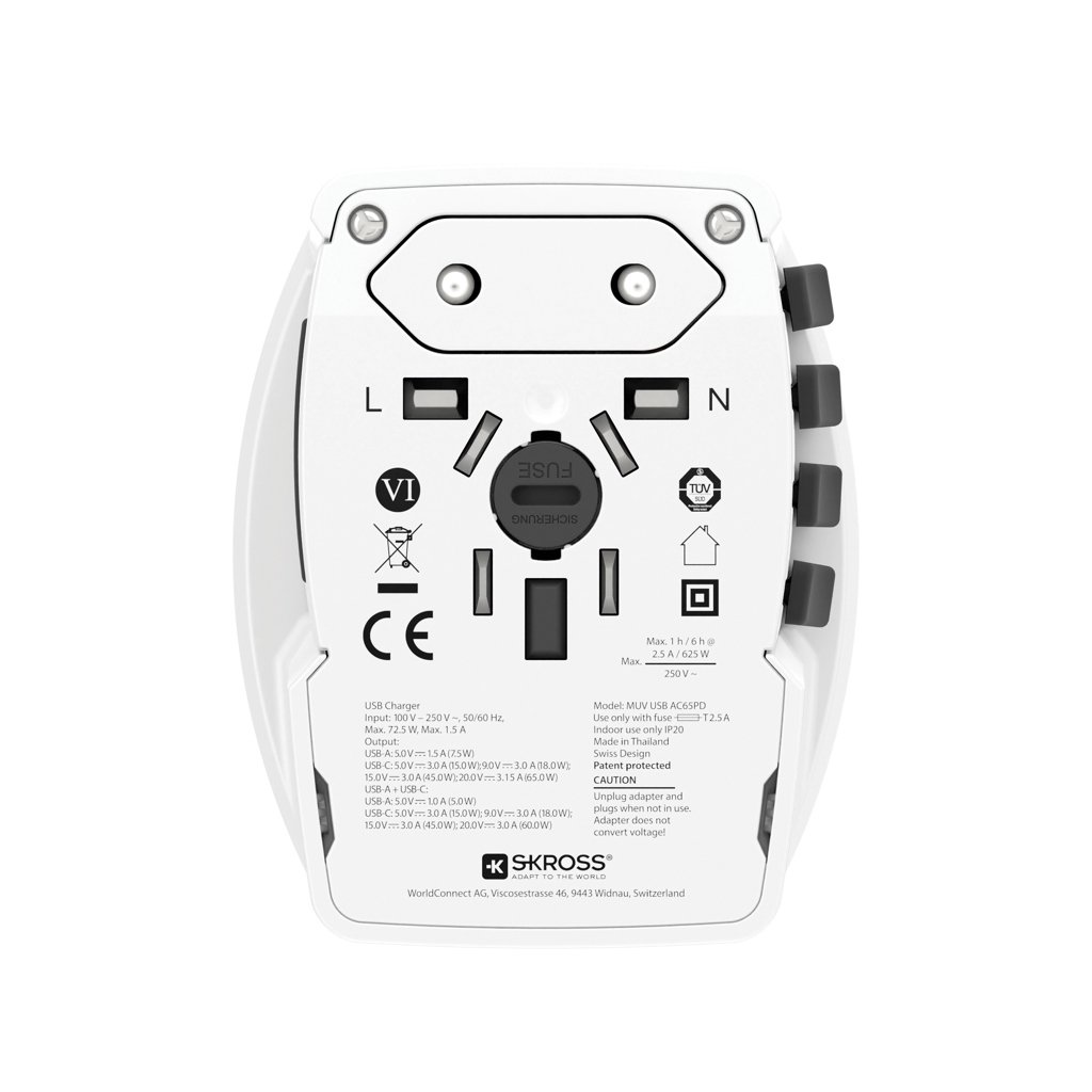 Descopera puterea incarcarii rapide oriunde te afli cu SKROSS World Travel Adapter MUV 65W PD, adaptor universal premium pentru calatorii internationale. Echipat cu 1 port USB-C Power Delivery (65W) si 1 port USB-A, permite incarcarea simultana a laptopului, tabletei si smartphone-ului tau la viteza maxima, in timp ce adaptorul poate fi folosit si pentru un alt dispozitiv fara impamantare. Designul compact si elegant il face ideal pentru calatorii, oferind performanta ridicata si siguranta. Include cablu USB-C de 65W pentru o incarcare eficienta si stabila.
