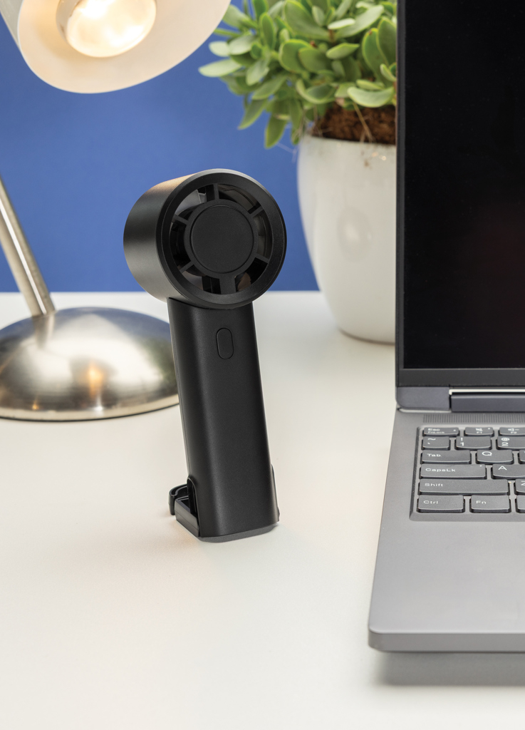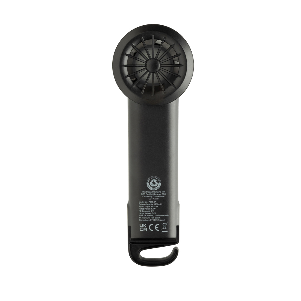 Ventilator portabil reincarcabil Twist din plastic reciclat certificat RCS, cu 3 viteze, baterie Li-ion 1200 mAh si carlig extensibil pentru utilizare flexibila.