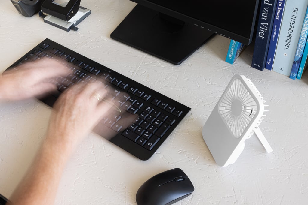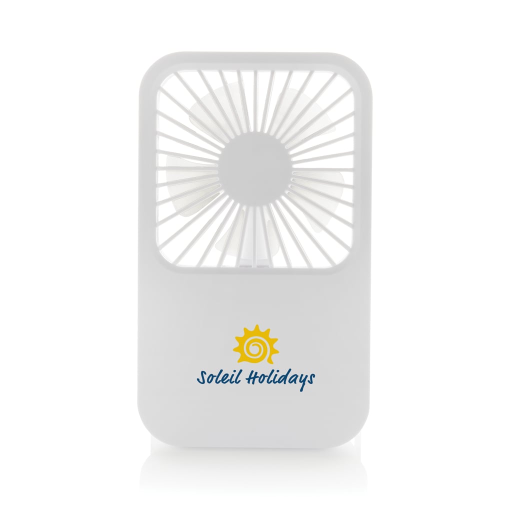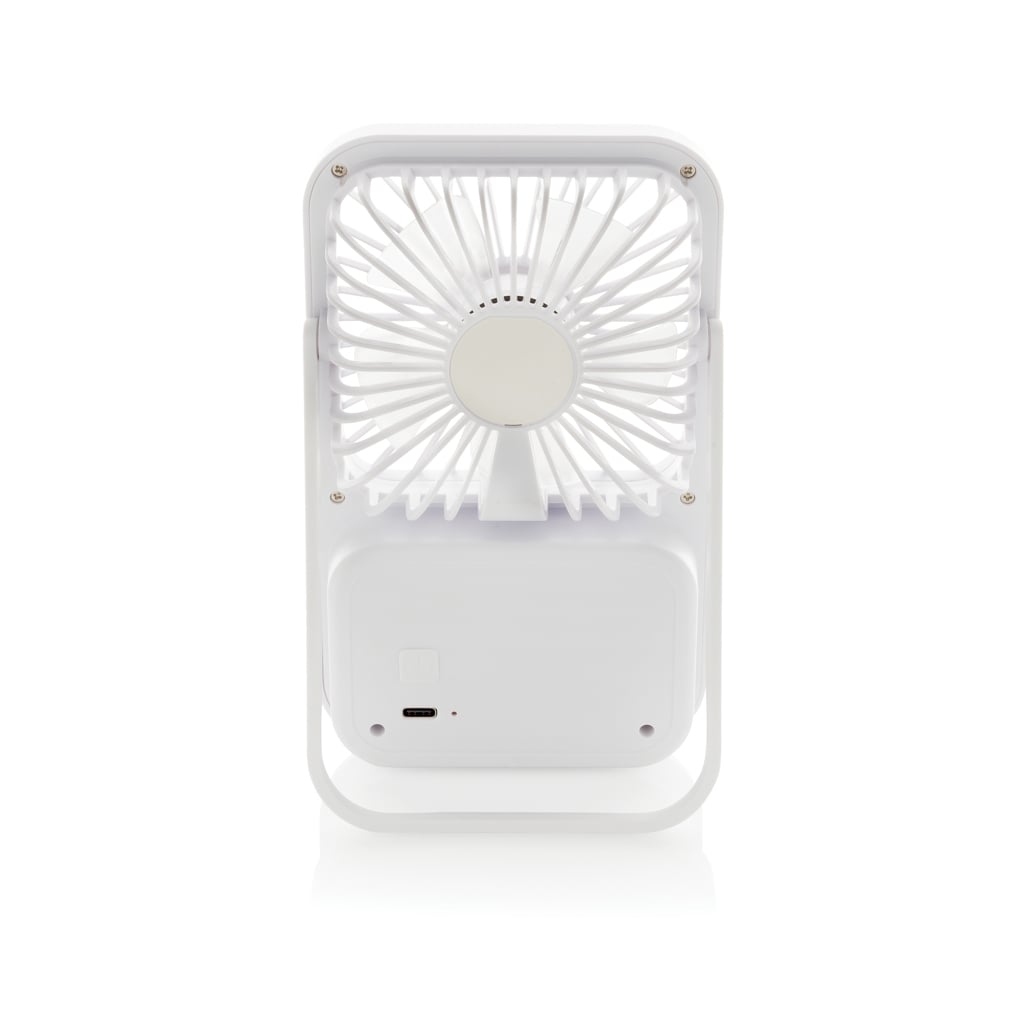 Ventilator de birou reincarcabil Aervina din plastic reciclat certificat RCS, cu 3 viteze, suport ajustabil si baterie Li-ion de 1200 mAh, ideal pentru utilizare acasa sau la birou.