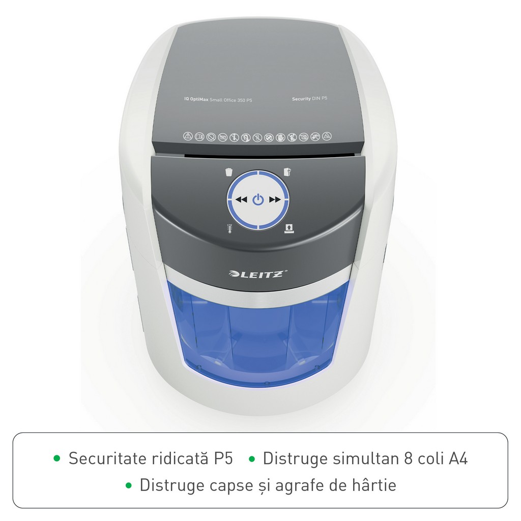 Distrugatorul Leitz IQ OptiMax Small Office 350 iti ofera protectie avansata a datelor si eficienta zilnica, intr-un format compact, ideal pentru birouri mici.