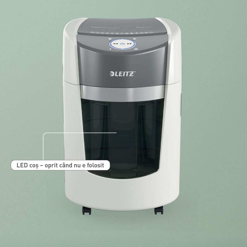 Distrugătorul Leitz IQ OptiMax pentru birouri mici oferă o soluție de distrugere inovatoare și elegantă, concepută pentru a oferi o securitate excepțională a documentelor și liniște sufletească. Acest distrugător de hârtie DIN P5 de înaltă securitate distruge fără efort până la 8x coli A4 în bucăți micro-cut, fiind astfel distrugătorul perfect pentru uz personal și de birou. Dispune de tehnologia unică de Rotație a Coșului (BRT), care maximizează în mod eficient capacitatea acestuia cu +33%.