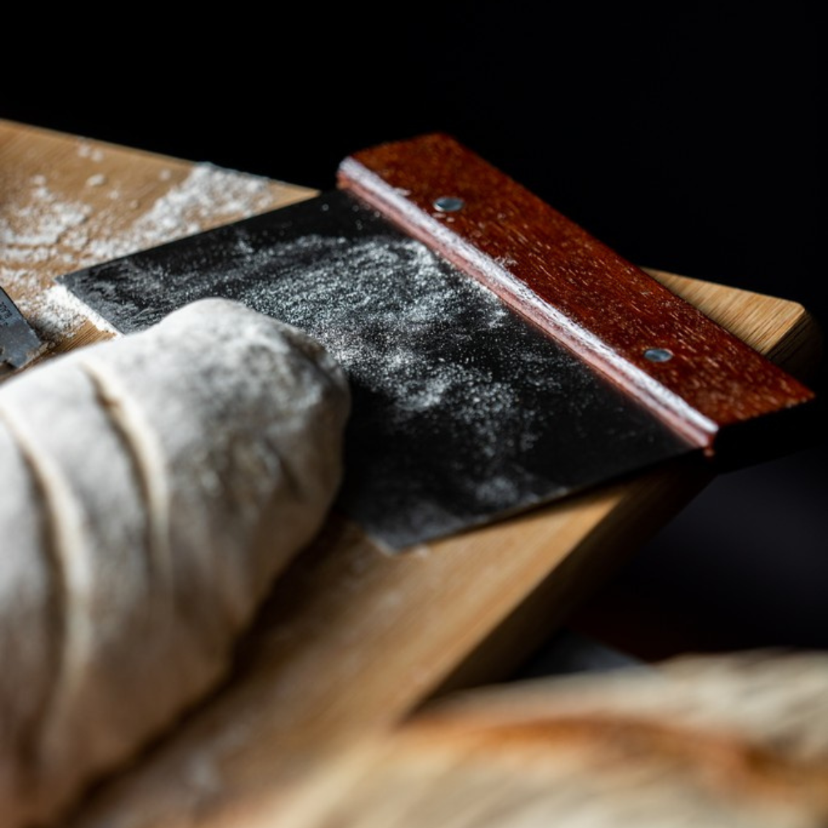 Un cutit de portionat ergonomic si adaptat taierii pe blat a aluaturilor inalte.