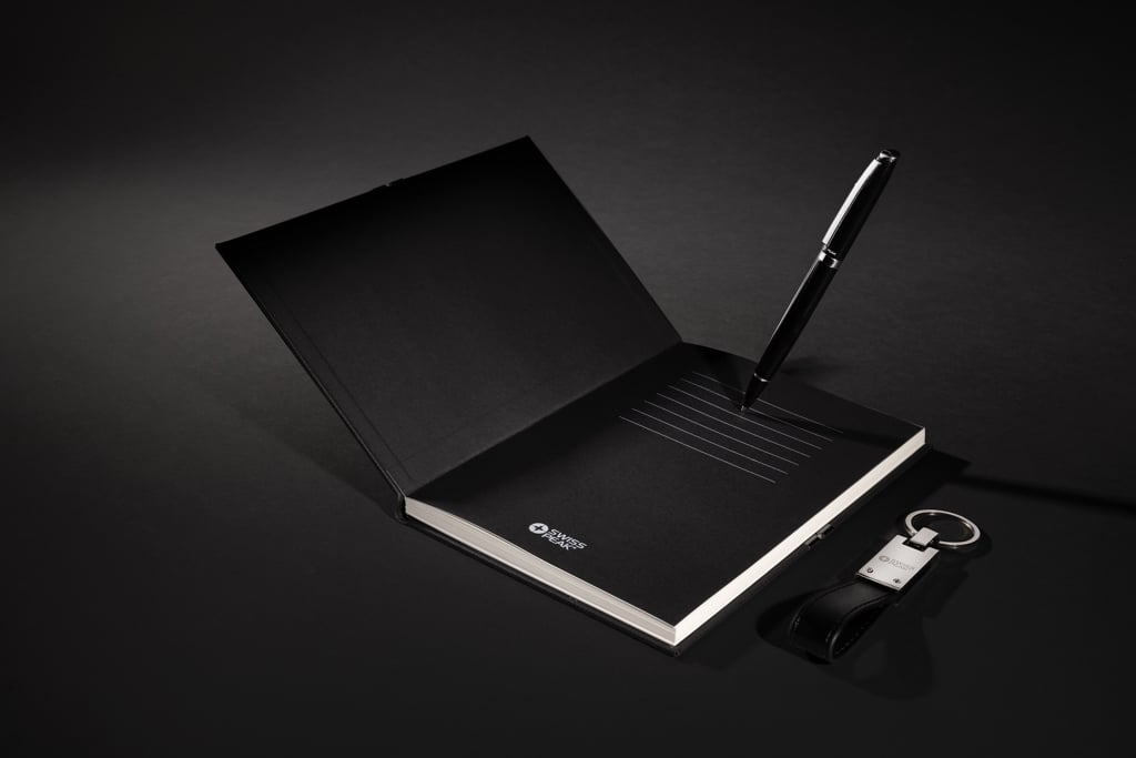 Set cadou business premium cu breloc, pix si caiet, realizate din materiale reciclate si certificate RCS, ideal pentru uz profesional zilnic.