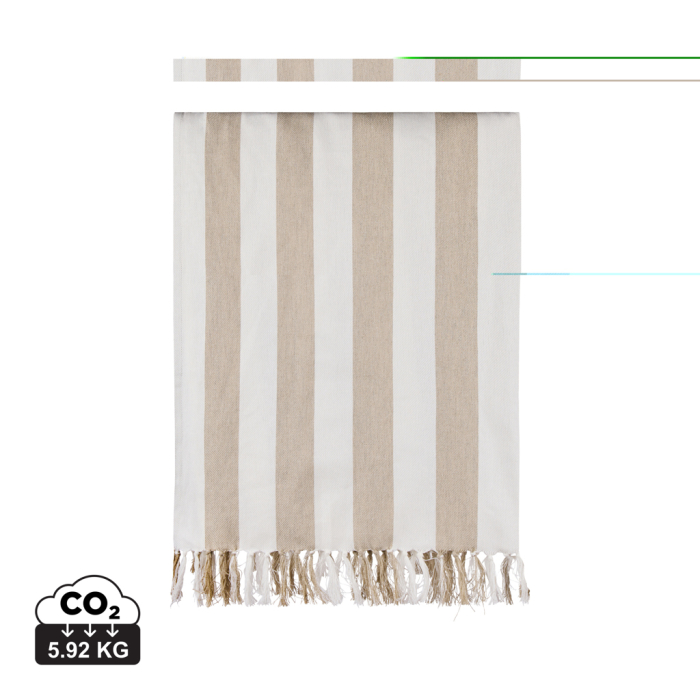 Prosop hammam de plaja VINGA Ornos pentru familie, 180 x 180 cm, cu design in dungi si franjuri, realizat din bumbac si poliester reciclat certificat GRS.
