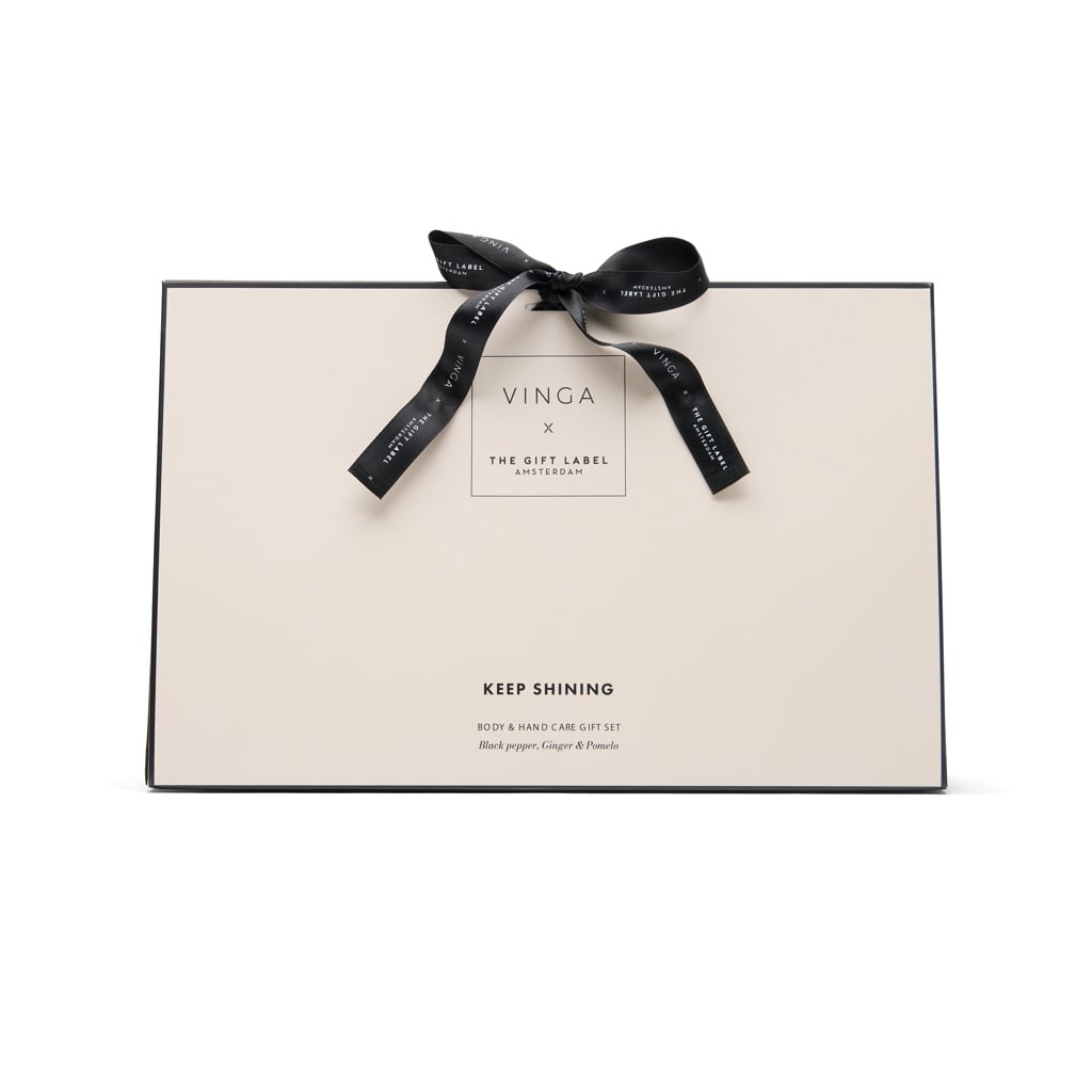 Set cadou VINGA x TGL pentru ingrijirea corpului si a mainilor cu 4 produse de 100 ml: body wash, body lotion, sapun lichid si lotiune pentru maini.