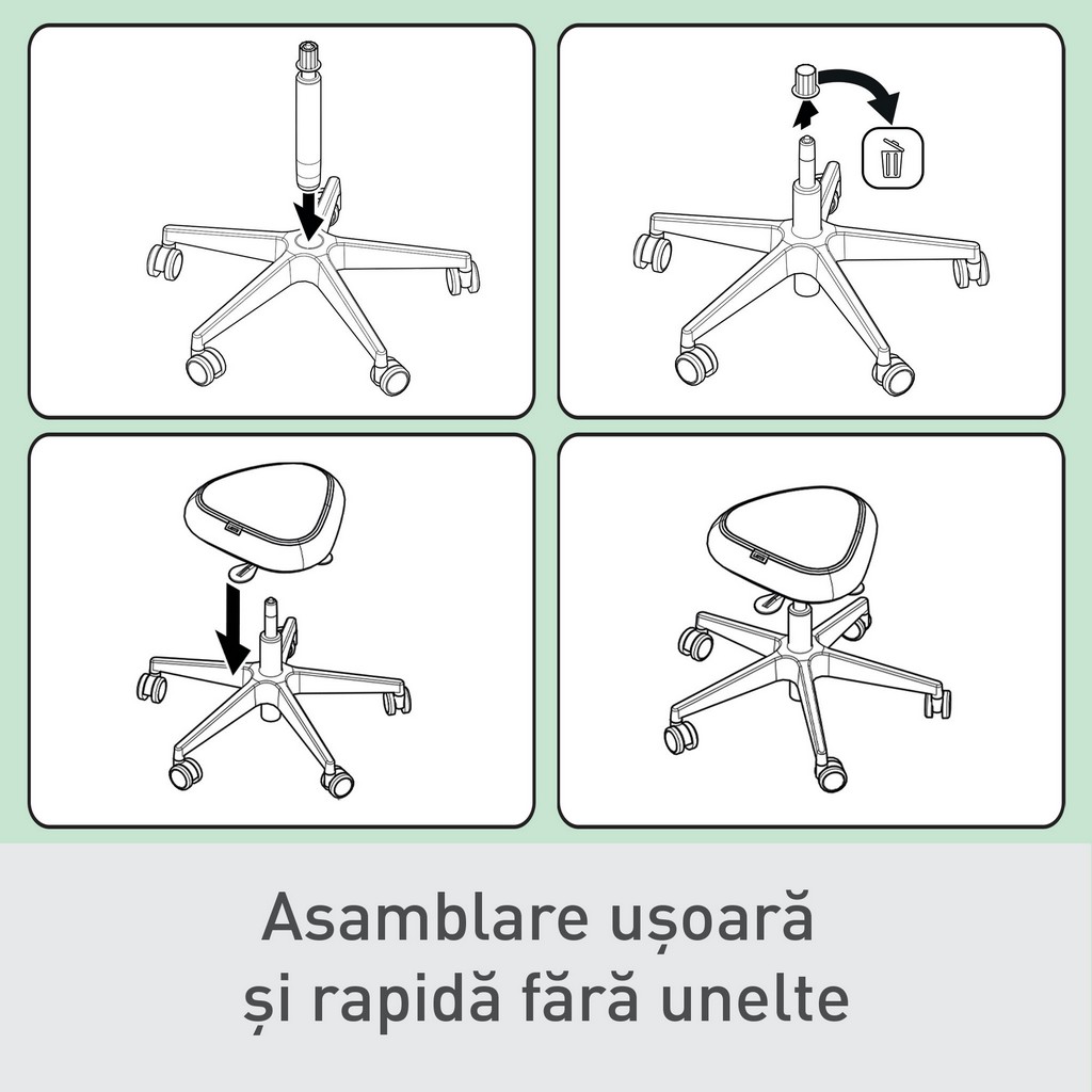 - 5 roți pivotante cu rezistență automată – oferă mobilitate pe toate tipurile de podele și previn mișcarea accidentală atunci când scaunul nu este ocupat.