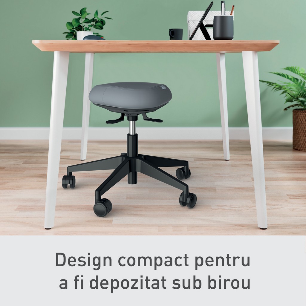 Scaun ergonomic Leitz Ergo cu roți, cu șezut tip șa, spumă DDF Dual Density și tehnologie DSM 360°. Reglabil 47-60 cm, stabil și certificat ergonomic