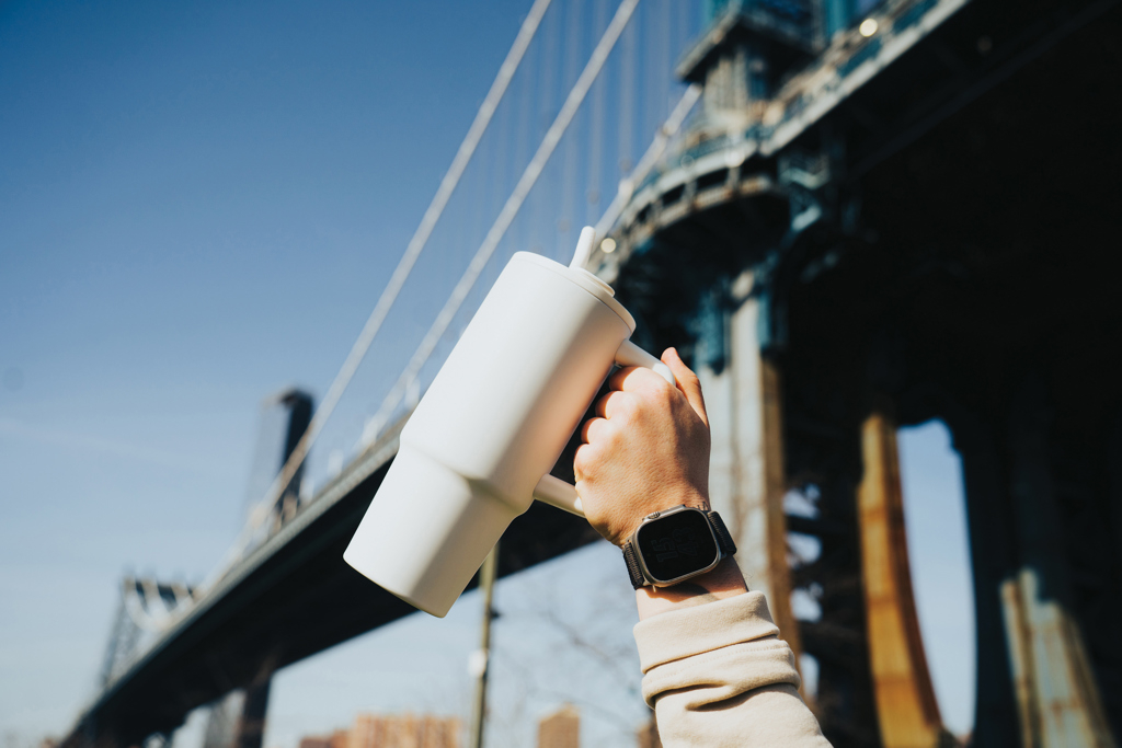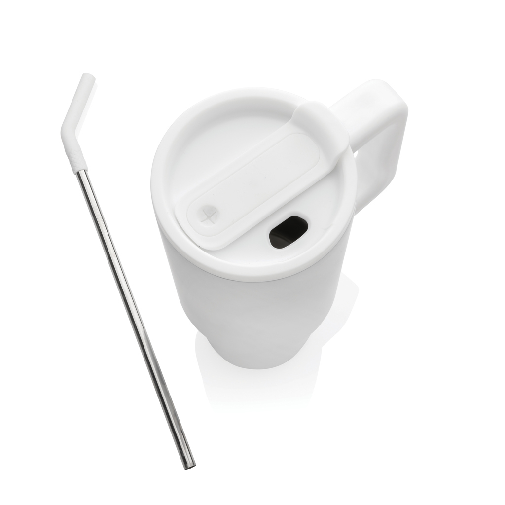 Fabricat din otel inoxidabil reciclat certificat RCS (70% din greutatea totala), paharul este sustenabil si rezistent. Are maner ergonomic, baza subtire compatibila cu suporturile auto si un capac cu functie dubla: poti bea direct prin gura de scurgere sau cu paiul din otel reciclat inclus, prevazut cu varf de silicon. Este BPA free, recomandat pentru spalare manuala si vine ambalat in cutie cadou FSC®.