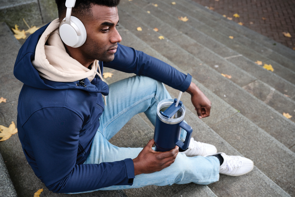 Exteriorul este realizat din otel inoxidabil reciclat certificat RCS (29% din greutatea totala), garantand trasabilitatea materialelor si un impact redus asupra mediului. Are maner ergonomic cu prindere confortabila si baza subtire compatibila cu suporturile auto. Capacul etans este prevazut cu functie dubla: poti bea direct sau cu paiul din plastic reciclat inclus. Este BPA free, recomandat pentru spalare manuala si livrat ambalat in vrac, fiind o alegere practica si sustenabila.