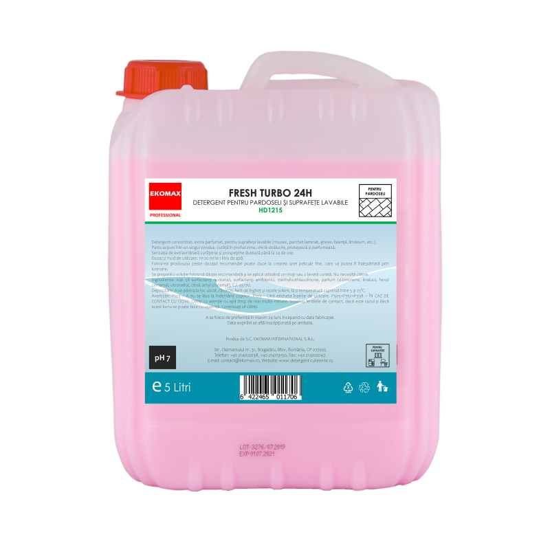Fresh Turbo 24H este un detergent concentrat extra parfumat pentru pardoseli si suprafete lavabile, conceput pentru curatare eficienta si utilizare frecventa. Curata in profunzime, ofera stralucire, protejeaza suprafetele si lasa un parfum placut de lunga durata.